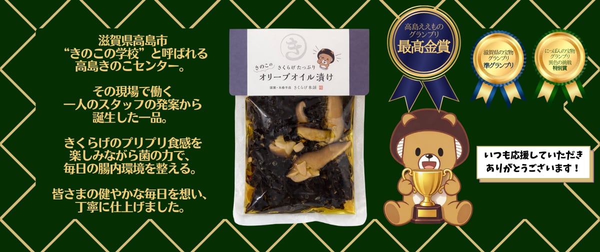 風味豊かなきのこを上質なオリーブオイルに漬け込んだ「きのこのオリーブオイル漬け」。厳選されたきのこが持つ自然の旨味と香りが、オリーブオイルと絶妙に絡み合い、深い味わいを楽しむことができます。この一品は、そのままおつまみとしてはもちろん、サラダやパスタ、ピザなどのトッピングにも最適です。 きのこの持つ栄養素とオリーブオイルに含まれる健康成分を一緒に摂取できます♪♪ ★2024年【高島ええものグランプリ】にて ”最高金賞” を受賞致しました。 ★2025年5月8日フジテレビの【サン!シャイン】で紹介頂きました。 ------------------------------------ きのこは弊社自慢のきくらげを主に使用しています。 ※その他きのこは時期によって種類が変更になる可能性があります。